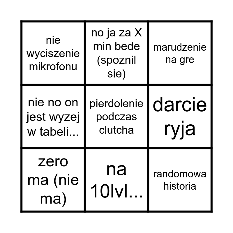 This bingo card has 12 words: mój ziomek..., randomowa historia, pierdolenie podczas clutcha, darcie ryja, no ja za X min bede (spoznil sie), marudzenie na gre, na 10lvl..., pro tip, nie wyciszenie mikrofonu, nie no on jest wyzej w tabeli..., zero ma (nie ma) and nie sluchanie calla.