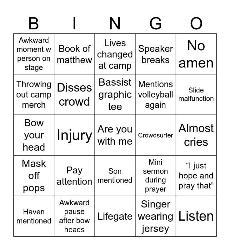This bingo card has a free space and 26 words: Son mentioned, Singer wearing jersey, Bassist graphic tee, Awkward pause after bow heads, No amen, Awkward moment w person on stage, Throwing out camp merch, Book of matthew, Almost cries, Mini sermon during prayer, Mentions volleyball again, Bow your head, “I just hope and pray that”, Haven mentioned, Injury, Pastor being a good father in sermon, Speaker breaks, Mask off pops, Lives changed at camp, Listen, Slide malfunction, Lifegate, Crowdsurfer, Pay attention, Disses crowd and Doesn’t mention son.