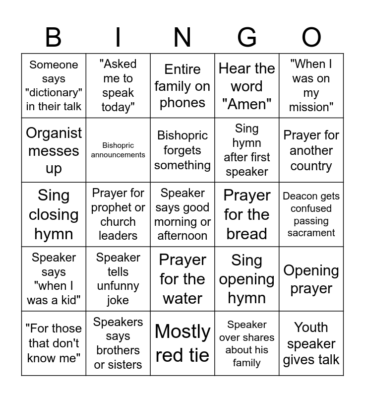This bingo card has 25 words: Speaker tells unfunny joke, Mostly red tie, Bishopric forgets something, "For those that don't know me", "When I was on my mission", Someone says "dictionary" in their talk, Organist messes up, "Asked me to speak today", Prayer for the bread, Prayer for the water, Sing hymn after first speaker, Sing closing hymn, Sing opening hymn, Opening prayer, Bishopric announcements, Youth speaker gives talk, Deacon gets confused passing sacrament, Entire family on phones, Prayer for another country, Prayer for prophet or church leaders, Speaker says good morning or afternoon, Speakers says brothers or sisters, Speaker says "when I was a kid", Hear the word "Amen" and Speaker over shares about his family.