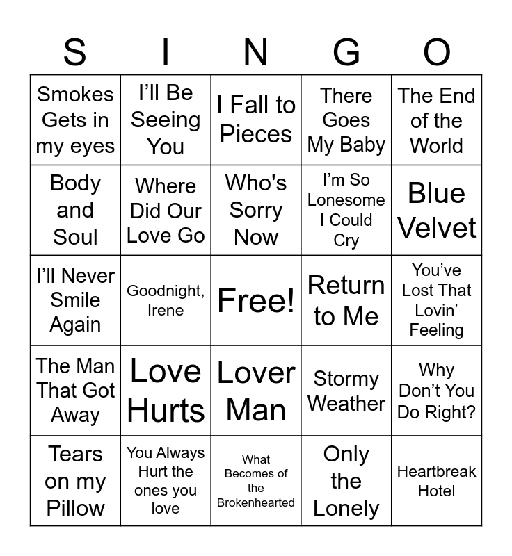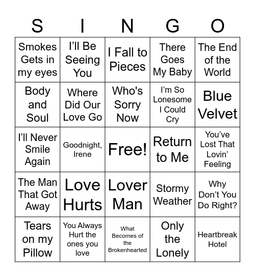 This bingo card has a free space and 24 words: Love Hurts, You Always Hurt the ones you love, Who's Sorry Now, Tears on my Pillow, The End of the World, Smokes Gets in my eyes, Body and Soul, I’ll Be Seeing You, Return to Me, Lover Man, I’m So Lonesome I Could Cry, I’ll Never Smile Again, Stormy Weather, Why Don’t You Do Right?, Where Did Our Love Go, Only the Lonely, You’ve Lost That Lovin’ Feeling, I Fall to Pieces, Blue Velvet, Goodnight, Irene, Heartbreak Hotel, The Man That Got Away, There Goes My Baby and What Becomes of the Brokenhearted.