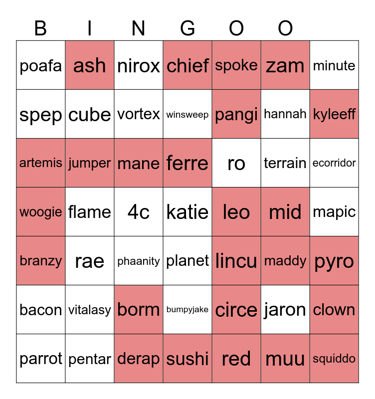 This bingo card has 49 words: jaron, hannah, red, flame, mane, mapic, ash, derap, zam, planet, minute, chief, terrain, ro, vitalasy, mid, spep, kyleeff, clown, spoke, pangi, 4c, poafa, cube, parrot, vortex, ecorridor, pentar, ferre, jumper, squiddo, leo, bacon, borm, woogie, lincu, maddy, pyro, artemis, phaanity, bumpyjake, branzy, katie, sushi, winsweep, nirox, circe, rae and muu.