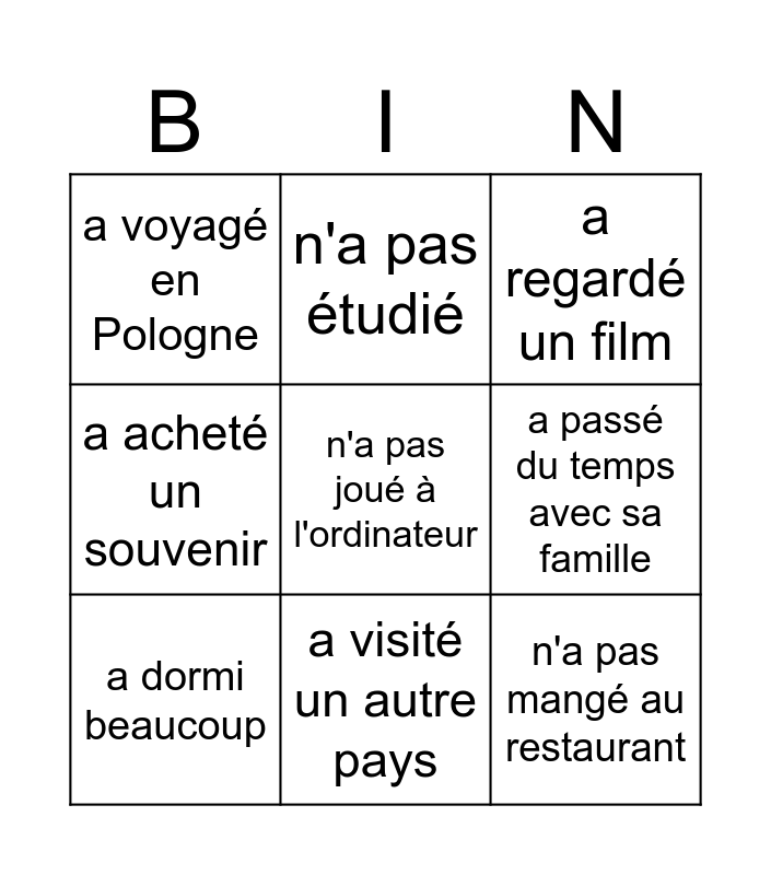 This bingo card has a free space and 8 words: a passé du temps avec sa famille, a regardé un film, n'a pas étudié, a dormi beaucoup, a voyagé en Pologne, n'a pas mangé au restaurant, a acheté un souvenir and a visité un autre pays.