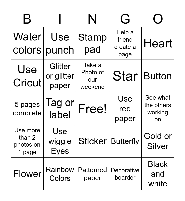 This bingo card has a free space and 24 words: Use wiggle Eyes, Rainbow Colors, Take a Photo of our weekend, Flower, Heart, Water colors, Use Cricut, Use punch, Use red paper, Sticker, Star, 5 pages complete, Butterfly, Gold or Silver, Glitter or glitter paper, Decorative boarder, See what the others working on, Stamp pad, Button, Tag or label, Black and white, Use more than 2 photos on 1 page, Help a friend create a page and Patterned paper.