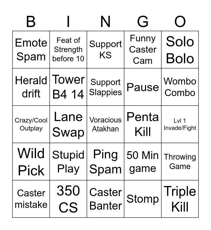 This bingo card has a free space and 33 words: Baron/Dragon steal, Soul, Lane Swap, 6 Grubs, Wild Pick, Tower B4 14, Solo Bolo, Caster mistake, Feat of Strength before 10, Botched Dive, Support Slappies, Support KS, Funny/Awkward moment, Team gets Over 25 petals, Penta Kill, Wombo Combo, 350 CS, Crazy/Cool Outplay, Stupid Play, 50 Min game, Ping Spam, Silver Scrapes, Emote Spam, Lvl 1 Invade/Fight, Caster Banter, Triple Kill, Funny Caster Cam, Pause, Herald drift, Throwing Game, Team Chanting, Stomp and Moan in ad.