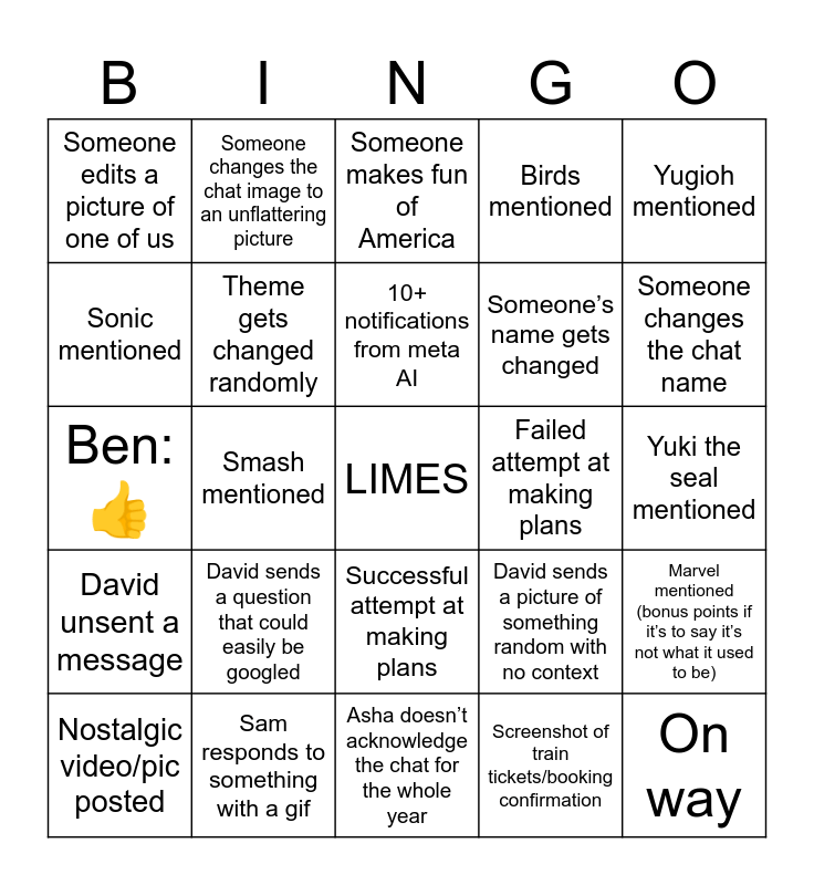 This bingo card has a free space and 24 words: David sends a question that could easily be googled, Sam responds to something with a gif, 10+ notifications from meta AI, Nostalgic video/pic posted, Yugioh mentioned, Someone edits a picture of one of us, Sonic mentioned, Someone changes the chat image to an unflattering picture, Failed attempt at making plans, Successful attempt at making plans, Someone’s name gets changed, Ben: 👍, David sends a picture of something random with no context, Marvel mentioned (bonus points if it’s to say it’s not what it used to be), Theme gets changed randomly, Screenshot of train tickets/booking confirmation, Yuki the seal mentioned, Someone makes fun of America, Someone changes the chat name, Smash mentioned, On way, David unsent a message, Birds mentioned and Asha doesn’t acknowledge the chat for the whole year.