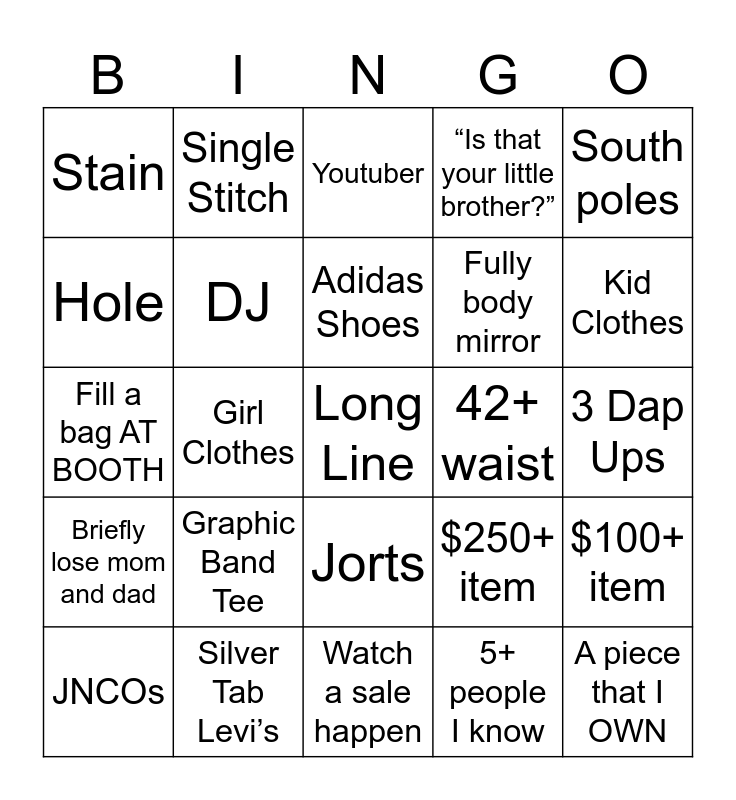 This bingo card has a free space and 24 words: Graphic Band Tee, Silver Tab Levi’s, Adidas Shoes, JNCOs, South poles, Stain, Hole, Single Stitch, 42+ waist, Jorts, Fully body mirror, Fill a bag AT BOOTH, $250+ item, $100+ item, DJ, 5+ people I know, 3 Dap Ups, Youtuber, Kid Clothes, Girl Clothes, A piece that I OWN, Briefly lose mom and dad, “Is that your little brother?” and Watch a sale happen.
