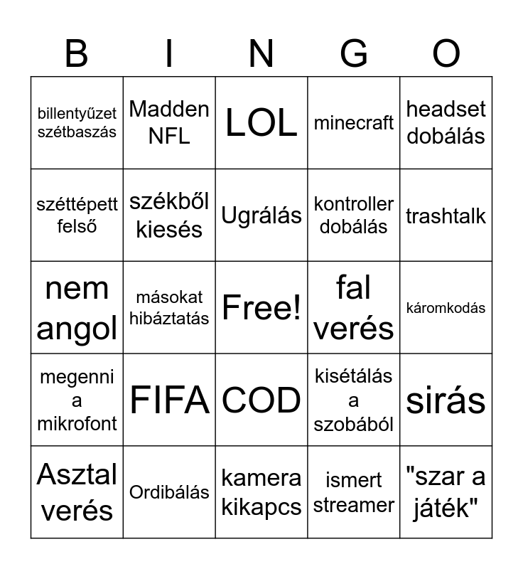 This bingo card has a free space and 24 words: FIFA, Ordibálás, Ugrálás, Asztal verés, headset dobálás, billentyűzet szétbaszás, széttépett felső, Madden NFL, fal verés, COD, kontroller dobálás, nem angol, kisétálás a szobából, sirás, székből kiesés, ismert streamer, káromkodás, LOL, trashtalk, másokat hibáztatás, "szar a játék", megenni a mikrofont, minecraft and kamera kikapcs.