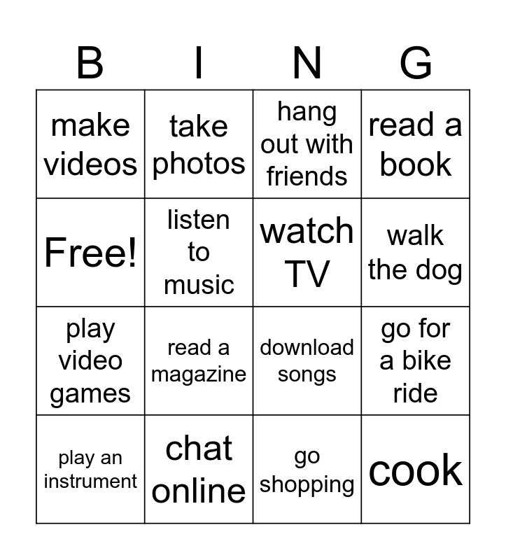 This bingo card has 16 words: chat online, go for a bike ride, hang out with friends, make videos, play video games, take photos, download songs, go shopping, Free!, listen to music, play an instrument, read a book, read a magazine, walk the dog, watch TV and cook.