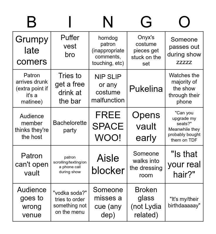 This bingo card has a free space and 24 words: patron scrolling/texting/on a phone call during show, "vodka soda?" tries to order something not on the menu, NIP SLIP or any costume malfunction, Audience goes to wrong venue, Someone passes out during show zzzzz, Grumpy late comers, Patron arrives drunk (extra point if it's a matinee), Puffer vest bro, Opens vault early, Aisle blocker, Pukelina, Audience member thinks they're the host, Someone walks into the dressing room, "Is that your real hair?", Tries to get a free drink at the bar, Broken glass (not Lydia related), "Can you upgrade my seats?" Meanwhile they probably bought them on TDF, horndog patron (inappropriate comments, touching, etc), Watches the majority of the show through their phone, Bachelorette party, "It's my/their birthdaaaaay", Patron can't open vault, Onyx's costume pieces get stuck on the set and Someone misses a cue (any dep).