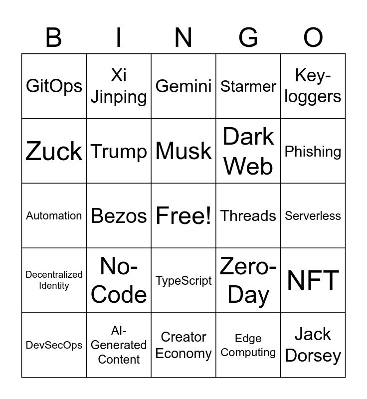 This bingo card has a free space and 77 words: ChatGPT, DeepSeek, Gemini, Claude, Llama, Hallucination, Prompt Engineering, Fine-tuning, OpenAI, DeepMind, AutoGPT, LoRA, Musk, Zuck, SBF, Bezos, Tim Apple, Jack Dorsey, Ransomware, Key-loggers, Malware, Automation, Trump, Xi Jinping, Starmer, Adarma, Python, VMs, Zero Trust, MFA, SOC, EDR, Threat Intelligence, Zero-Day, Phishing, Dark Web, Social Engineering, Kubernetes, Serverless, Edge Computing, Hybrid Cloud, Cloudflare, CloudStrike, S3 Bucket, API Gateway, Terraform, DevSecOps, GitOps, LangChain, WASM, Rust, TypeScript, Python, Full Stack, Microservices, GraphQL, Web3, Quantum Computing, AutoML, Low-Code, No-Code, AI Workflow, AI Assistants, Copilot, LLMOps, Cloud Automation, Data Pipelines, Threads, Bluesky, Mastodon, X, NFT, Decentralized Identity, AI-Generated Content, Virtual Influencers, Creator Economy and Digital Nomads.