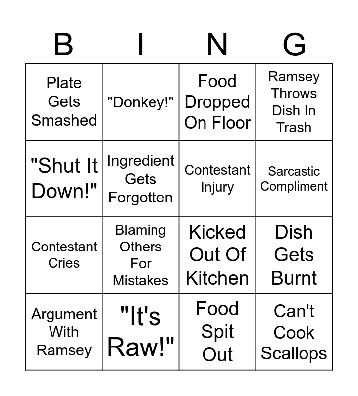 This bingo card has 16 words: "It's Raw!", Dish Gets Burnt, Food Dropped On Floor, Plate Gets Smashed, Contestant Cries, "Donkey!", Kicked Out Of Kitchen, Food Spit Out, "Shut It Down!", Ingredient Gets Forgotten, Argument With Ramsey, Ramsey Throws Dish In Trash, Blaming Others For Mistakes, Sarcastic Compliment, Contestant Injury and Can't Cook Scallops.