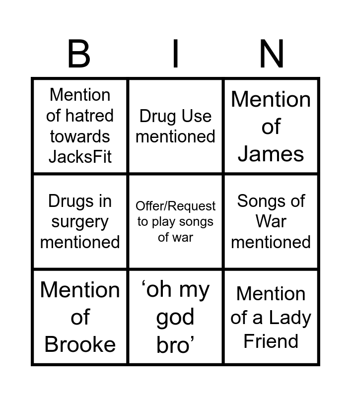 This bingo card has 9 words: Mention of Brooke, Mention of James, Drug Use mentioned, Drugs in surgery mentioned, Mention of hatred towards JacksFit, Songs of War mentioned, Offer/Request to play songs of war, Mention of a Lady Friend and ‘oh my god bro’.