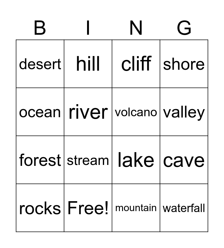 This bingo card has 16 words: Free!, cave, cliff, desert, forest, hill, lake, mountain, ocean, river, rocks, shore, stream, valley, volcano and waterfall.