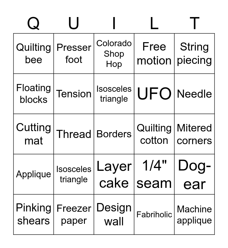 ⚠ This card has duplicate items: 1/4" seam (2), Applique (2), Backing (2), Backstitch (2), Basting (2), Batiks (2), Batting (2), Bias (2), Binding (2), Binding foot (2), Blanket stitch (2), Block (2), Borders (2), Bobbins (2), Calico (2), Chain piecing (2), Charm pack (2), Color wheel (2), Complementary colors (2), Cornerstones (2), Crazy quilting (2), Cutting mat (2), Design wall (2), Dog-ear (2), Echo quilting (2), Embellishment (2), Embroidery (2), English paper piecing (2), Equilateral triangles (2), Fabric grain (2), Fabriholic (2), Fat eight (2), Fat quarter (2), Feed dogs (2), Flannel (2), Floating blocks (2), Flower head pins (2), Free motion (2), Freezer paper (2), Fussy cutting (2), Hand piecing (2), HST (2), In the ditch quilting (2), Iron (2), Isosceles triangle (2), Jelly roll (2), Label (2), Lap quilt (2), Layer cake (2), LOF (2), Longarm quilting (2), Machine applique (2), Machine quilting (2), Marking tool (2), Mitered corners (2), Needle (2), Needle threader (2), Notions (2), Novelty print (2), Paper piecing (2), Partial seams (2), Pattern (2), Pieced border (2), Pin baste (2), Pin cushion (2), Presser foot (2), Primary colors (2), QST (2), Quilting bee (2), Quilting cotton (2), Red work (2), Reproduction fabrics (2), Rotary cutter (2), Sampler quilt (2), Sashing (2), Scissors (2), Scraps (2), Scrim (2), Seam guide (2), Seam ripper (2), Selvage (2), Silk pins (2), Spool (2), Square up (2), Stippling (2), Stitch length (2), String piecing (2), Template (2), Tension (2), Thimble (2), Thread (2), UFO (2), Walking foot (2), WOF (2)