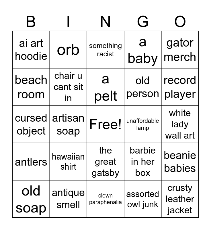 This bingo card has a free space and 24 words: hawaiian shirt, antique smell, a pelt, old soap, gator merch, ai art hoodie, beach room, orb, unaffordable lamp, the great gatsby, old person, cursed object, barbie in her box, beanie babies, chair u cant sit in, assorted owl junk, white lady wall art, something racist, record player, artisan soap, crusty leather jacket, antlers, a baby and clown paraphenalia.