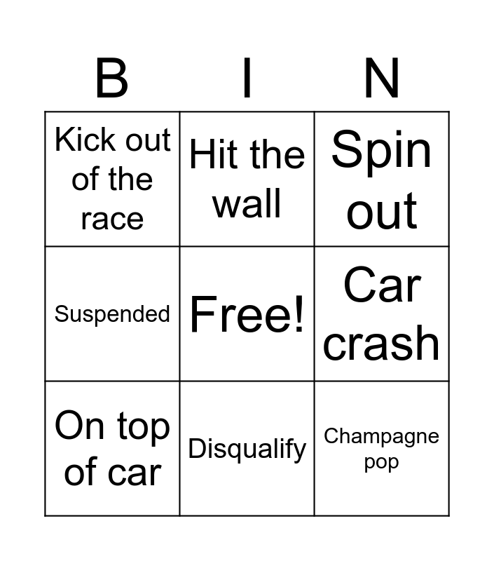 This bingo card has a free space and 8 words: Car crash, Spin out, Hit the wall, On top of car, Kick out of the race, Champagne pop, Suspended and Disqualify.