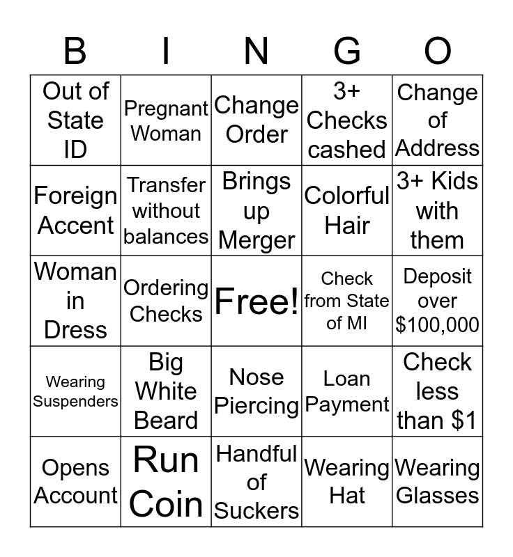This bingo card has a free space and 24 words: Big White Beard, Run Coin, Brings up Merger, Opens Account, Change of Address, Out of State ID, Foreign Accent, Pregnant Woman, Check from State of MI, Nose Piercing, Colorful Hair, Woman in Dress, Loan Payment, Check less than $1, Transfer without balances, Wearing Hat, Deposit over $100,000, Change Order, 3+ Kids with them, Ordering Checks, Wearing Glasses, Wearing Suspenders, 3+ Checks cashed and Handful of Suckers.