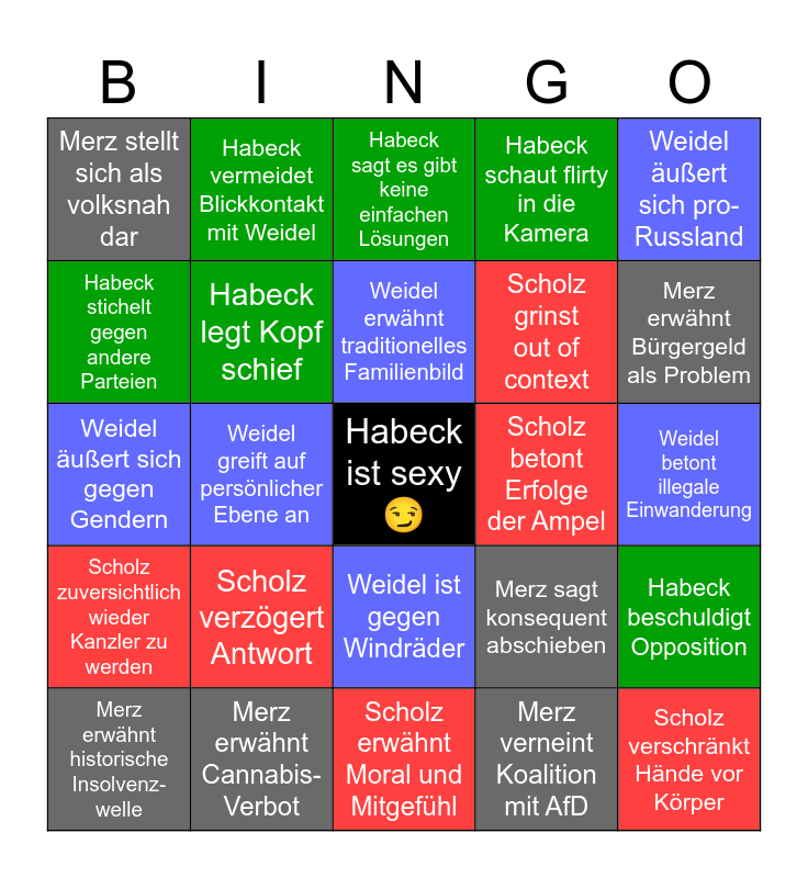 This bingo card has a free space and 24 words: Scholz verzögert Antwort, Merz erwähnt Cannabis-Verbot, Weidel erwähnt traditionelles Familienbild, Merz erwähnt historische Insolvenz-welle, Weidel äußert sich pro-Russland, Merz stellt sich als volksnah dar, Habeck stichelt gegen andere Parteien, Habeck vermeidet Blickkontakt mit Weidel, Scholz betont Erfolge der Ampel, Weidel ist gegen Windräder, Scholz grinst out of context, Weidel äußert sich gegen Gendern, Merz sagt konsequent abschieben, Habeck beschuldigt Opposition, Habeck legt Kopf schief, Merz verneint Koalition mit AfD, Weidel betont illegale Einwanderung, Habeck sagt es gibt keine einfachen Lösungen, Merz erwähnt Bürgergeld als Problem, Weidel greift auf persönlicher Ebene an, Scholz verschränkt Hände vor Körper, Scholz zuversichtlich wieder Kanzler zu werden, Habeck schaut flirty in die Kamera and Scholz erwähnt Moral und Mitgefühl.