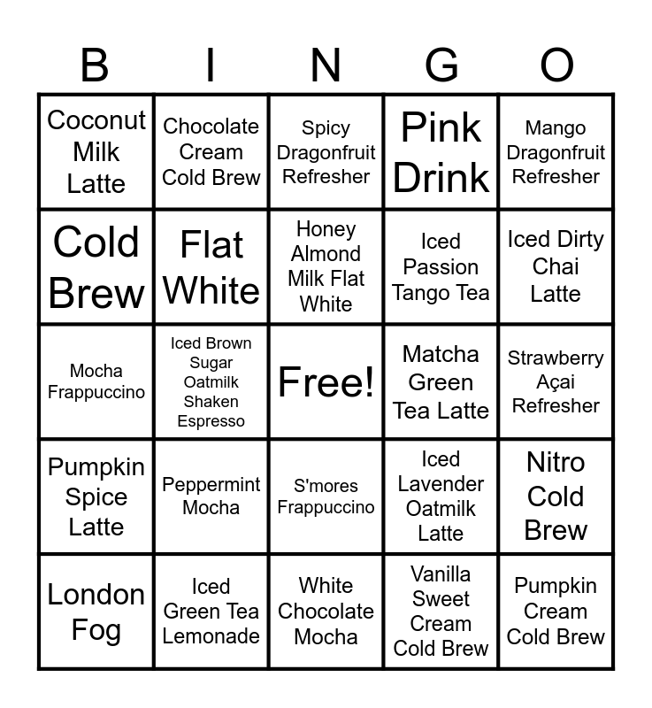 This bingo card has a free space and 24 words: Peppermint Mocha, Iced Green Tea Lemonade, Honey Almond Milk Flat White, London Fog, Mango Dragonfruit Refresher, Coconut Milk Latte, Cold Brew, Chocolate Cream Cold Brew, Matcha Green Tea Latte, S'mores Frappuccino, Iced Passion Tango Tea, Mocha Frappuccino, Iced Lavender Oatmilk Latte, Nitro Cold Brew, Flat White, Vanilla Sweet Cream Cold Brew, Strawberry Açai Refresher, Spicy Dragonfruit Refresher, Iced Dirty Chai Latte, Iced Brown Sugar Oatmilk Shaken Espresso, Pumpkin Cream Cold Brew, Pumpkin Spice Latte, Pink Drink and White Chocolate Mocha.
