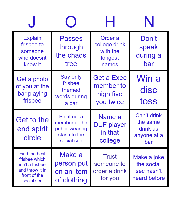 This bingo card has 26 words: Throw a disc between two colleges, Drink from a disc, Win a disc toss, Only drink a drink the colour of the college, Get a photo of you at the bar playing frisbee, Explain frisbee to someone who doesnt know it, Say only frisbee themed words during a bar, Passes through the chads tree, Trust someone to order a drink for you, Mention loudly the win against the college, Get to the end spirit circle, Name a DUF player in that college, Drink a drink with your initials, Give an in-depth review about the college and drink to a member of the exec, Can’t drink the same drink as anyone at a bar, Get a blue drink, Don’t speak during a bar, Make a joke the social sec hasn’t heard before, Order a college drink with the longest names, Find the best frisbee which isn’t a frisbee and throw it in front of the social sec, Point out a member of the public wearing stash to the social sec, Quote a film line from a media and get a member of the exec to recognise it, Make a person put on an item of clothing, Make a person take off an item of clothing, Get a Exec member to high five you twice and Say ‘guess what’ and get a player to say what.