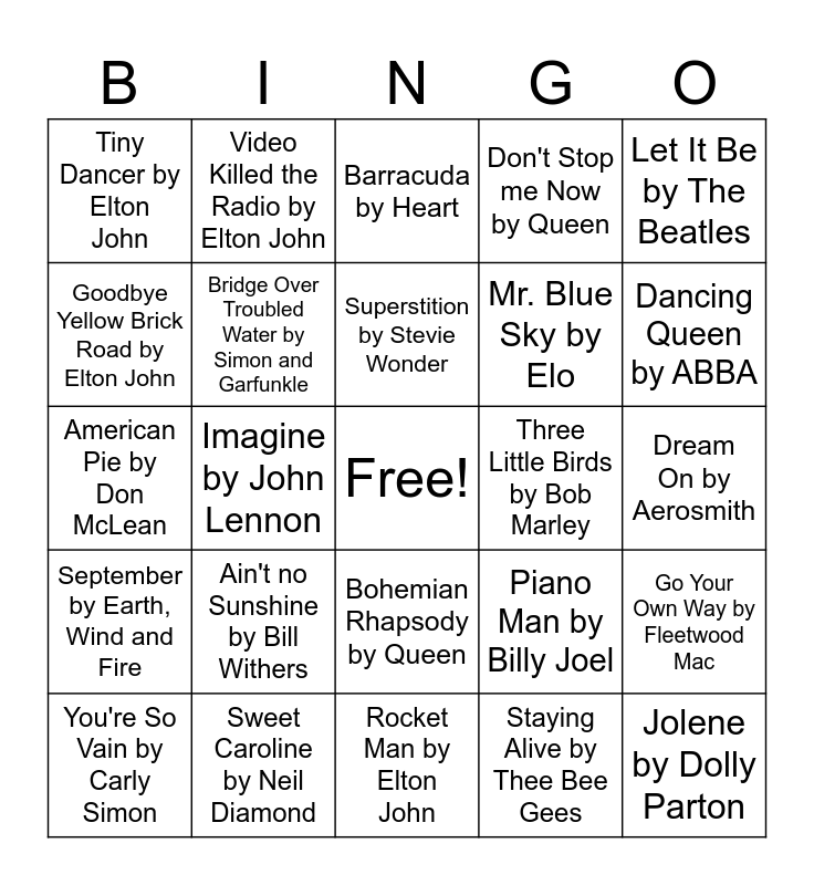This bingo card has a free space and 24 words: Ain't no Sunshine by Bill Withers, Sweet Caroline by Neil Diamond, Superstition by Stevie Wonder, You're So Vain by Carly Simon, Let It Be by The Beatles, Tiny Dancer by Elton John, Goodbye Yellow Brick Road by Elton John, Video Killed the Radio by Elton John, Three Little Birds by Bob Marley, Bohemian Rhapsody by Queen, Mr. Blue Sky by Elo, American Pie by Don McLean, Piano Man by Billy Joel, Go Your Own Way by Fleetwood Mac, Bridge Over Troubled Water by Simon and Garfunkle, Staying Alive by Thee Bee Gees, Dream On by Aerosmith, Barracuda by Heart, Dancing Queen by ABBA, Imagine by John Lennon, Jolene by Dolly Parton, September by Earth, Wind and Fire, Don't Stop me Now by Queen and Rocket Man by Elton John.