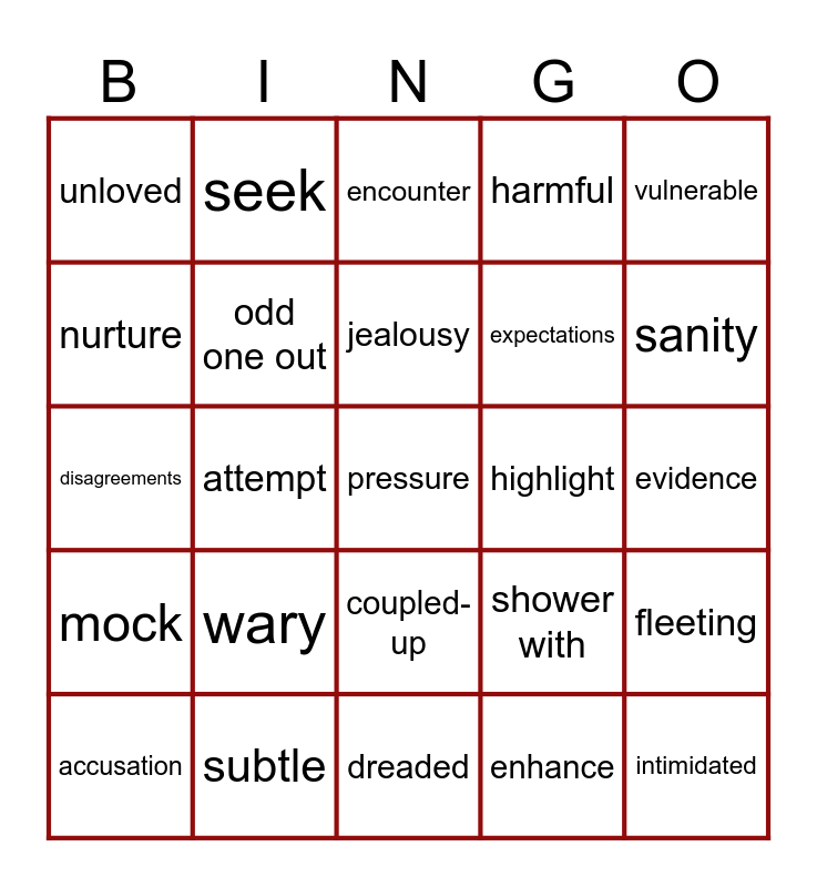 This bingo card has a free space and 24 words: wary, subtle, jealousy, accusation, vulnerable, unloved, nurture, seek, highlight, coupled-up, expectations, disagreements, shower with, fleeting, odd one out, enhance, evidence, encounter, sanity, attempt, intimidated, mock, harmful and dreaded.