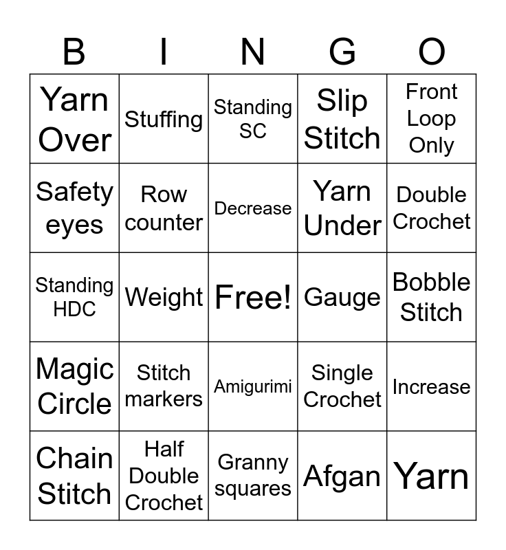 This bingo card has a free space and 46 words: Crochet hook, Yarn, Scissors, Granny squares, Stitch markers, Tapestry needle, Stuffing, Darning needle, Safety eyes, Wires, Row counter, Slip Stitch, Increase, Single Crochet, Blocking, Chart, Decrease, Gauge, Back Loop Only, Front Loop Only, Weight, Afgan, Yarn Over, Yarn Under, Triple Crochet, Double Crochet, Chain Stitch, Pattern, Amigurimi, Magic Circle, Slip Stitch, Tunisian Crochet, Shell Stitch, Frogging, WIP, Half Double Crochet, Bobble Stitch, Skein, Cotton, Acrylic, Wool, Standing SC, Standing HDC, Standing DC, Front Post and Back Post.