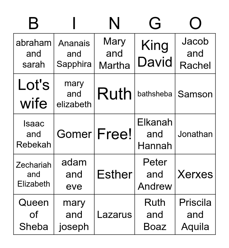 This bingo card has a free space and 24 words: adam and eve, mary and joseph, Ruth, Queen of Sheba, Jacob and Rachel, abraham and sarah, Lot's wife, Ananais and Sapphira, Elkanah and Hannah, Esther, bathsheba, Isaac and Rebekah, Peter and Andrew, Xerxes, mary and elizabeth, Ruth and Boaz, Jonathan, Mary and Martha, Samson, Gomer, Priscila and Aquila, Zechariah and Elizabeth, King David and Lazarus.