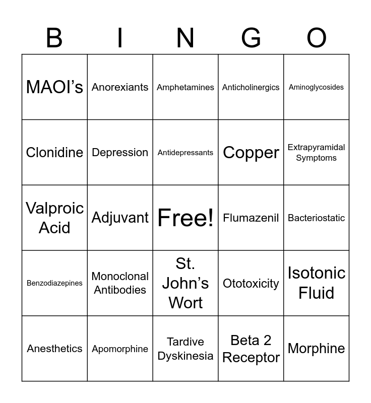 This bingo card has a free space and 28 words: Isotonic Fluid, Colloid Solutions, Copper, Beta 2 Receptor, Clonidine, Amphetamines, Anorexiants, Benzodiazepines, Flumazenil, Anesthetics, Valproic Acid, Anticholinergics, Apomorphine, Tardive Dyskinesia, Extrapyramidal Symptoms, Immunosuppressant, Monoclonal Antibodies, Depression, Antidepressants, St. John’s Wort, MAOI’s, Inflammation, Morphine, Adjuvant, Bacteriostatic, Ototoxicity, Aminoglycosides and Antivirals.