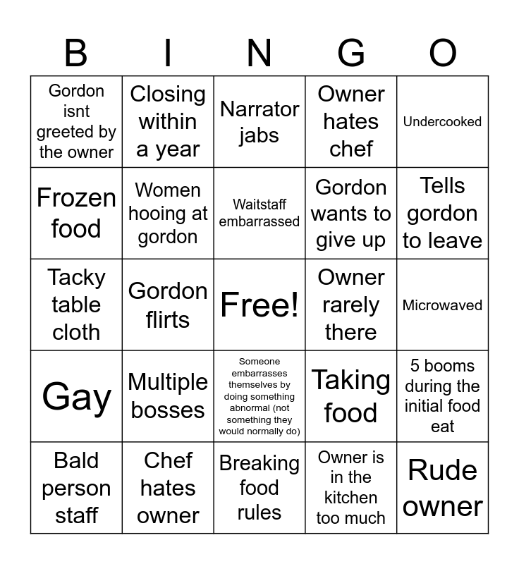 This bingo card has a free space and 24 words: Multiple bosses, Chef hates owner, Waitstaff embarrassed, Bald person staff, Undercooked, Gordon isnt greeted by the owner, Frozen food, Closing within a year, Owner rarely there, Someone embarrasses themselves by doing something abnormal (not something they would normally do), Gordon wants to give up, Tacky table cloth, Taking food, 5 booms during the initial food eat, Women hooing at gordon, Owner is in the kitchen too much, Microwaved, Narrator jabs, Tells gordon to leave, Gordon flirts, Rude owner, Gay, Owner hates chef and Breaking food rules.
