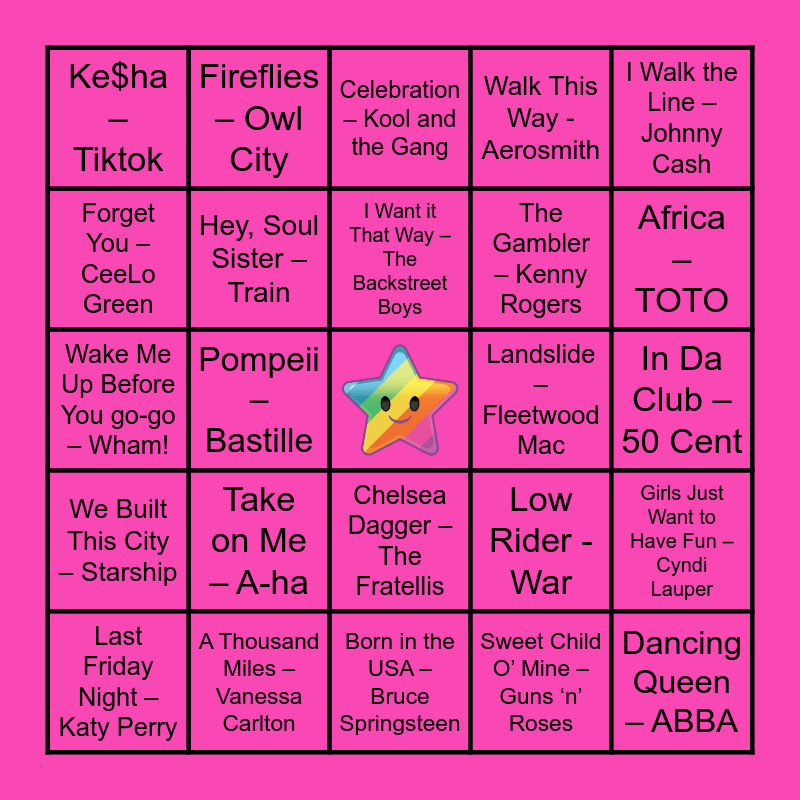 This bingo card has a free space and 50 words: Never Gonna Give You Up – Rick Astley, Dancing Queen – ABBA, Y.M.C.A – Village People, Born in the USA – Bruce Springsteen, Take on Me – A-ha, Carry On Wayward Son - Kansas, Fireflies – Owl City, Jessie’s Girl – Rick Springfield, Forget You – CeeLo Green, Free Fallin’ – Tom Petty, Hey, Soul Sister – Train, Walk This Way - Aerosmith, Girls Just Want to Have Fun – Cyndi Lauper, Low Rider - War, Don’t Stop Believin’ – Journey, You Spin Me Round – Dead or Alive, I Want it That Way – The Backstreet Boys, Landslide – Fleetwood Mac, Radioactive – Imagine Dragons, I Walk the Line – Johnny Cash, Pompeii – Bastille, Sweet Child O’ Mine – Guns ‘n’ Roses, Ke$ha – Tiktok, The Gambler – Kenny Rogers, All Star – Smash Mouth, Rocket Man – Elton John, Africa – TOTO, Master of Puppets – Metallica, Celebration – Kool and the Gang, Chelsea Dagger – The Fratellis, Who Let the Dogs Out – Baha Men, Save Tonight – Eagle Eye Cherry, Bad Day – Daniel Powter, I Gotta Feeling – Black Eyed Peas, A Thousand Miles – Vanessa Carlton, Without Me – Eminem, Sweet Home Alabama – Lynyrd Skynyrd, Sharp Dressed Man – ZZ Top, You Shook Me All Night Long – AC/DC, In Da Club – 50 Cent, Ice Ice Baby – Vanilla Ice, Unwritten – Natasha Bedingfield, Thriller – Micheal Jackson, Chasing Pavements – Adele, Last Friday Night – Katy Perry, Wake Me Up Before You go-go – Wham!, Escape – Rupert Holmes, I’m gonna Be (500 miles) – The Proclaimers, We Built This City – Starship and I Love Rock ‘n’ Roll – Joan Jett and The Blackhearts.