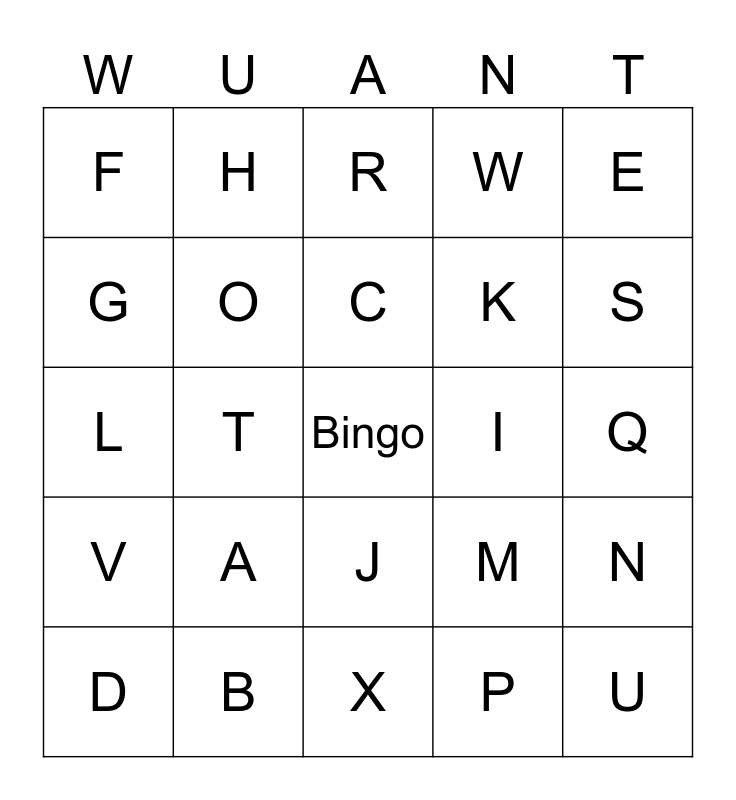 This bingo card has a free space and 24 words: A, B, C, D, E, F, G, H, I, J, K, L, M, N, O, P, Q, R, S, T, U, V, W and X.