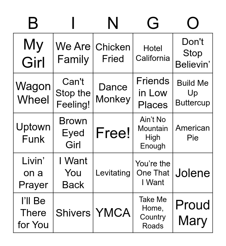 This bingo card has a free space and 40 words: Shake It Off, Uptown Funk, Happy, Can't Stop the Feeling!, Shivers, Levitating, Dance Monkey, Sweet Caroline, Don't Stop Believin’, Livin’ on a Prayer, Brown Eyed Girl, Hotel California, Proud Mary, American Pie, Ain’t No Mountain High Enough, I Want You Back, Respect, My Girl, Superstition, Chicken Fried, Jolene, Take Me Home, Country Roads, Friends in Low Places, Wagon Wheel, Girls Just Want to Have Fun, I Will Survive, Love Shack, Wannabe, Man! I Feel Like a Woman!, Bohemian Rhapsody, Let It Go, I’ll Be There for You, The Time of My Life, You’re the One That I Want, Build Me Up Buttercup, YMCA, Sweet Home Alabama, I Love Rock ‘n’ Roll, We Are Family and Hey Jude.