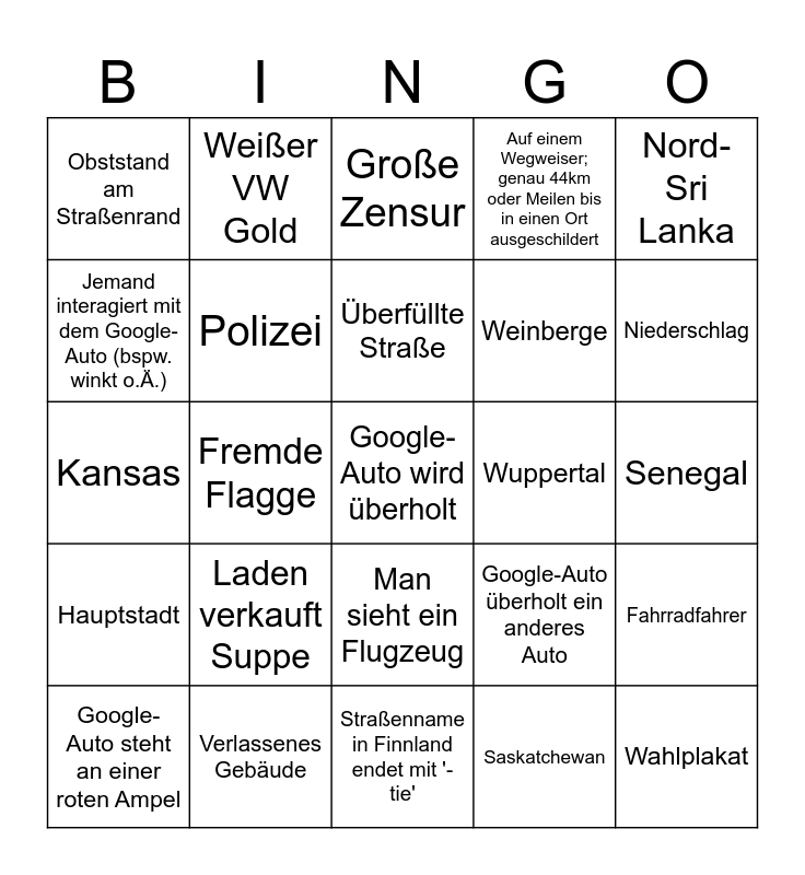 This bingo card has a free space and 24 words: Laden verkauft Suppe, Verlassenes Gebäude, Überfüllte Straße, Google-Auto steht an einer roten Ampel, Nord-Sri Lanka, Obststand am Straßenrand, Jemand interagiert mit dem Google-Auto (bspw. winkt o.Ä.), Weißer VW Gold, Wuppertal, Man sieht ein Flugzeug, Weinberge, Kansas, Google-Auto überholt ein anderes Auto, Fahrradfahrer, Polizei, Saskatchewan, Senegal, Große Zensur, Niederschlag, Fremde Flagge, Wahlplakat, Hauptstadt, Auf einem Wegweiser; genau 44km oder Meilen bis in einen Ort ausgeschildert and Straßenname in Finnland endet mit '-tie'.