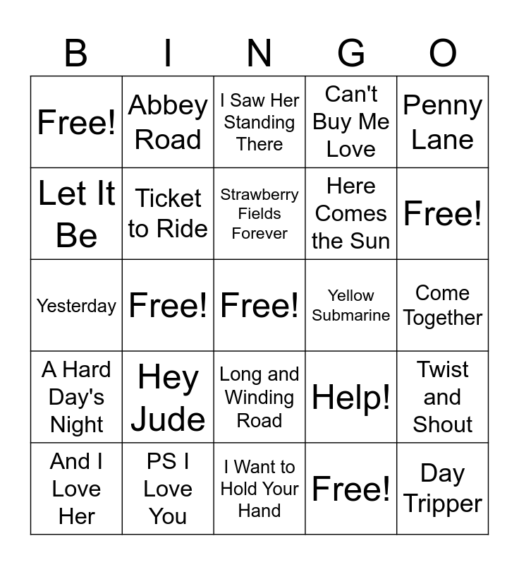 This bingo card has a free space and 24 words: And I Love Her, Hey Jude, Strawberry Fields Forever, Free!, Penny Lane, Free!, Abbey Road, I Saw Her Standing There, Yellow Submarine, Come Together, Yesterday, Ticket to Ride, Help!, Twist and Shout, Let It Be, PS I Love You, I Want to Hold Your Hand, Can't Buy Me Love, Free!, A Hard Day's Night, Free!, Long and Winding Road, Here Comes the Sun and Day Tripper.