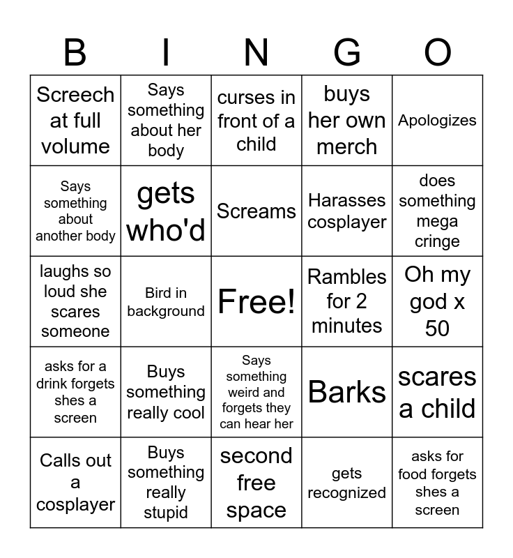 This bingo card has a free space and 24 words: Buys something really cool, Buys something really stupid, Screams, Calls out a cosplayer, Apologizes, Screech at full volume, Says something about another body, Says something about her body, Rambles for 2 minutes, Says something weird and forgets they can hear her, Harasses cosplayer, laughs so loud she scares someone, Barks, scares a child, gets who'd, gets recognized, Oh my god x 50, curses in front of a child, does something mega cringe, Bird in background, asks for food forgets shes a screen, asks for a drink forgets shes a screen, buys her own merch and second free space.