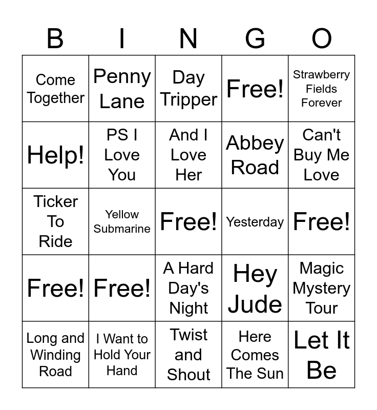 This bingo card has a free space and 24 words: Long and Winding Road, Free!, And I Love Her, Here Comes The Sun, Strawberry Fields Forever, Come Together, Penny Lane, Day Tripper, Yesterday, Free!, Ticker To Ride, PS I Love You, Hey Jude, Magic Mystery Tour, Help!, I Want to Hold Your Hand, Twist and Shout, Free!, Can't Buy Me Love, Free!, Yellow Submarine, A Hard Day's Night, Abbey Road and Let It Be.