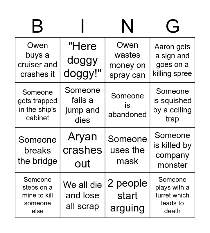 This bingo card has 16 words: We all die and lose all scrap, Someone is killed by company monster, Owen wastes money on spray can, Owen buys a cruiser and crashes it, Someone breaks the bridge, "Here doggy doggy!", Someone uses the mask, 2 people start arguing, Someone gets trapped in the ship's cabinet, Someone fails a jump and dies, Someone steps on a mine to kill someone else, Aaron gets a sign and goes on a killing spree, Aryan crashes out, Someone is squished by a ceiling trap, Someone is abandoned and Someone plays with a turret which leads to death.