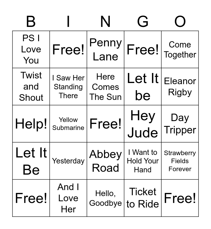 This bingo card has a free space and 24 words: Free!, Yesterday, Here Comes The Sun, Ticket to Ride, Come Together, PS I Love You, Free!, Penny Lane, Hey Jude, Day Tripper, Help!, I Saw Her Standing There, I Want to Hold Your Hand, Strawberry Fields Forever, Twist and Shout, And I Love Her, Hello, Goodbye, Free!, Eleanor Rigby, Let It Be, Yellow Submarine, Abbey Road, Let It be and Free!.