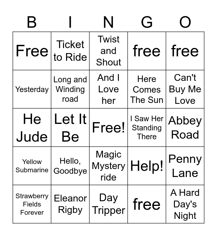 This bingo card has a free space and 24 words: Hello, Goodbye, Eleanor Rigby, And I Love her, Strawberry Fields Forever, free, Free, Yesterday, Ticket to Ride, I Saw Her Standing There, Magic Mystery ride, Here Comes The Sun, He Jude, Help!, Penny Lane, Long and Winding road, free, Abbey Road, Twist and Shout, Can't Buy Me Love, Let It Be, A Hard Day's Night, Yellow Submarine, free and Day Tripper.