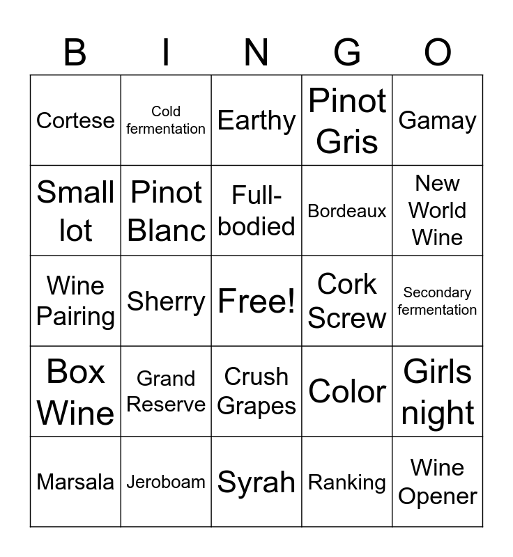 This bingo card has a free space and 57 words: Riesling, Marsala, Lambrusco, Cortese, Syrah, Frascati, Pinot Blanc, Grappa, Bordeaux, Cabernet Sauvignon, Pinot Gris, Malbec, Sauvignon Blanc, Bardolino, Rosé, Pinot Grigio, Gamay, Sherry, Cheers!, Wine Opener, Cork Screw, Delicious, Color, Earthy, Fermentation, Full-bodied, Harvest, Hybrid, New World Wine, Oaky, Oxidized, pH levels, Residual Sugar, Sommelier, Secondary fermentation, Small lot, Wine glass, Wine Pairing, Bottle Age, Box Wine, Cold fermentation, Crush Grapes, Decanting, Extraction, Finish, Fruity, Grand Reserve, Jeroboam, Vinology, Wine tasting, Yield, Ranking, Observation, Double bottle, Hungover, Girls night and No thank you.