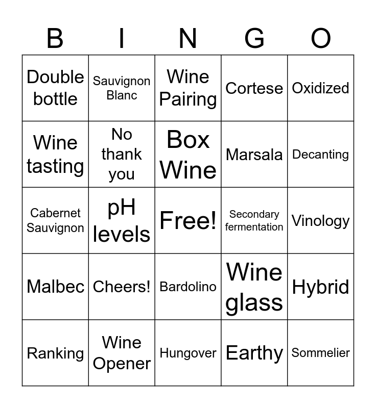 This bingo card has a free space and 57 words: Yield, Ranking, Observation, Double bottle, Hungover, Girls night, No thank you, Riesling, Marsala, Lambrusco, Cortese, Syrah, Frascati, Pinot Blanc, Grappa, Oaky, Oxidized, pH levels, Residual Sugar, Sommelier, Secondary fermentation, Small lot, Wine glass, Wine Pairing, Bottle Age, Box Wine, Cold fermentation, Crush Grapes, Decanting, Extraction, Finish, Fruity, Grand Reserve, Jeroboam, Vinology, Wine tasting, Bordeaux, Cabernet Sauvignon, Pinot Gris, Malbec, Sauvignon Blanc, Bardolino, Rosé, Pinot Grigio, Gamay, Sherry, Cheers!, Wine Opener, Cork Screw, Delicious, Color, Earthy, Fermentation, Full-bodied, Harvest, Hybrid and New World Wine.