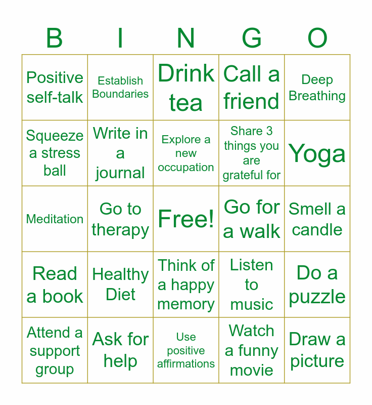 This bingo card has a free space and 24 words: Healthy Diet, Ask for help, Explore a new occupation, Attend a support group, Deep Breathing, Positive self-talk, Squeeze a stress ball, Establish Boundaries, Go for a walk, Think of a happy memory, Share 3 things you are grateful for, Meditation, Listen to music, Do a puzzle, Write in a journal, Watch a funny movie, Smell a candle, Drink tea, Yoga, Go to therapy, Draw a picture, Read a book, Call a friend and Use positive affirmations.
