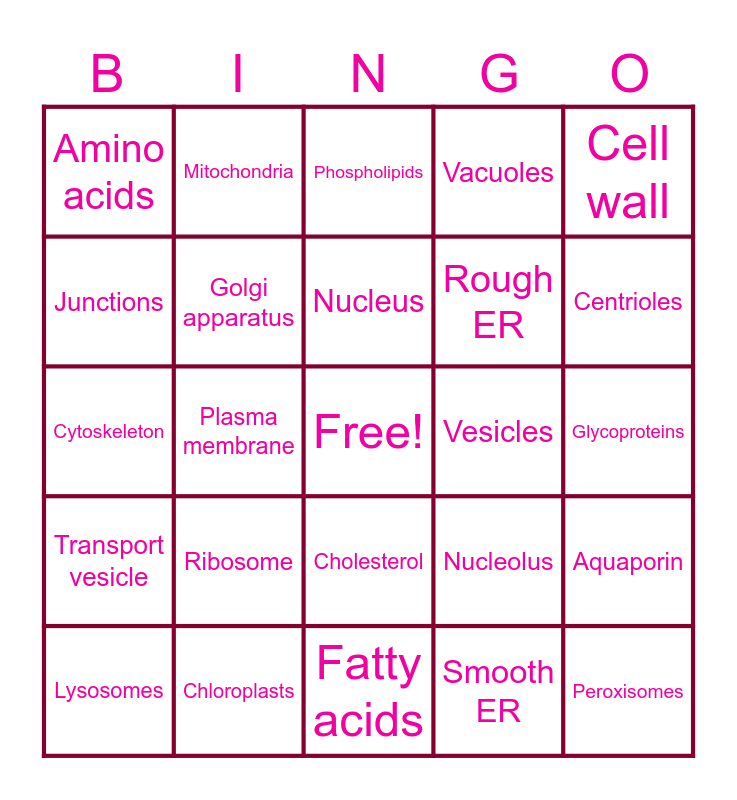This bingo card has a free space and 24 words: Ribosome, Chloroplasts, Nucleus, Lysosomes, Cell wall, Amino acids, Junctions, Mitochondria, Vesicles, Cholesterol, Rough ER, Cytoskeleton, Nucleolus, Aquaporin, Golgi apparatus, Smooth ER, Glycoproteins, Phospholipids, Centrioles, Plasma membrane, Peroxisomes, Transport vesicle, Vacuoles and Fatty acids.