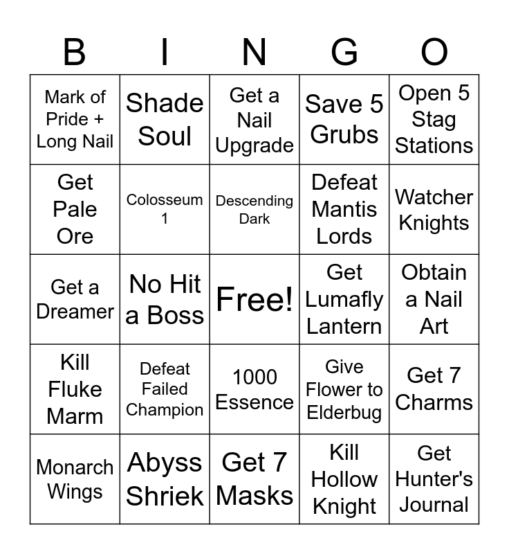 This bingo card has a free space and 24 words: Monarch Wings, Defeat Failed Champion, Descending Dark, Kill Hollow Knight, Open 5 Stag Stations, Mark of Pride + Long Nail, Shade Soul, Get a Nail Upgrade, Get Lumafly Lantern, Obtain a Nail Art, Get a Dreamer, Colosseum 1, Give Flower to Elderbug, Get 7 Charms, Get Pale Ore, Abyss Shriek, Get 7 Masks, Save 5 Grubs, Watcher Knights, Kill Fluke Marm, No Hit a Boss, 1000 Essence, Defeat Mantis Lords and Get Hunter's Journal.