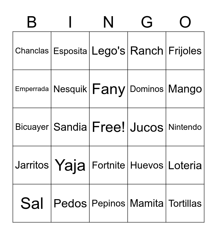 This bingo card has a free space and 42 words: Azula, Fany, Katy, Yaja, Mamita, Loteria, Tortillas, Pupusas, Lego's, Fortnite, Nintendo, Mango, Sandia, Frijoles, Queso, Huevos, Fresas, Bicuayer, Esposito, Esposita, Emperrada, Rinso, Chengas, Chanclas, Frozen, Uno!, Dominos, McChicken, Happy Meal, Coca Cola, Pepsi, Jarritos, Nesquik, Pepinos, Limon, Sal, Pedos, Jucos, Sopitas, Cheeseburger, Ranch and Ketchup.