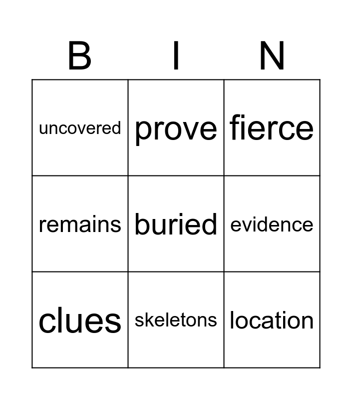 This bingo card has 9 words: clues, fierce, prove, remains, uncovered, evidence, buried, location and skeletons.
