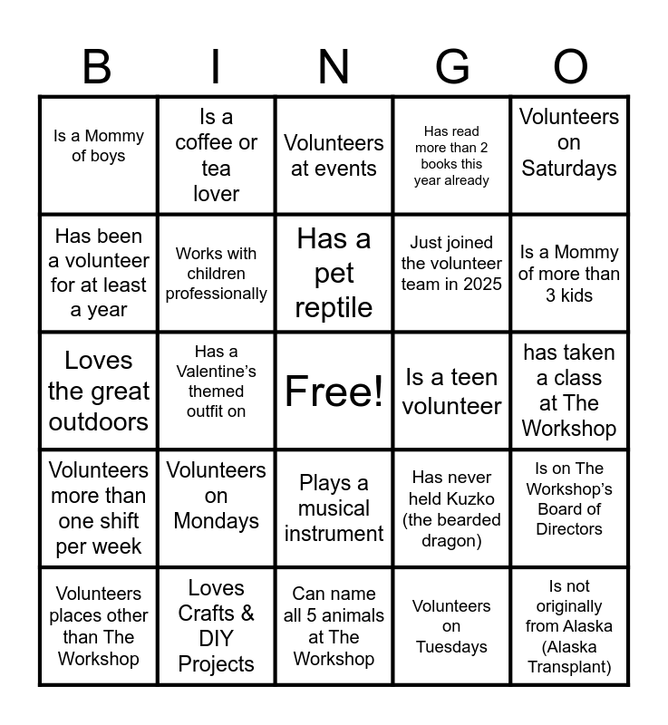 This bingo card has a free space and 24 words: Volunteers on Mondays, Loves Crafts & DIY Projects, Has a pet reptile, Volunteers places other than The Workshop, Volunteers on Saturdays, Is a Mommy of boys, Has been a volunteer for at least a year, Is a coffee or tea lover, Is a teen volunteer, Plays a musical instrument, Just joined the volunteer team in 2025, Loves the great outdoors, Has never held Kuzko (the bearded dragon), Is on The Workshop’s Board of Directors, Works with children professionally, Volunteers on Tuesdays, has taken a class at The Workshop, Volunteers at events, Is a Mommy of more than 3 kids, Has a Valentine’s themed outfit on, Is not originally from Alaska (Alaska Transplant), Volunteers more than one shift per week, Has read more than 2 books this year already and Can name all 5 animals at The Workshop.