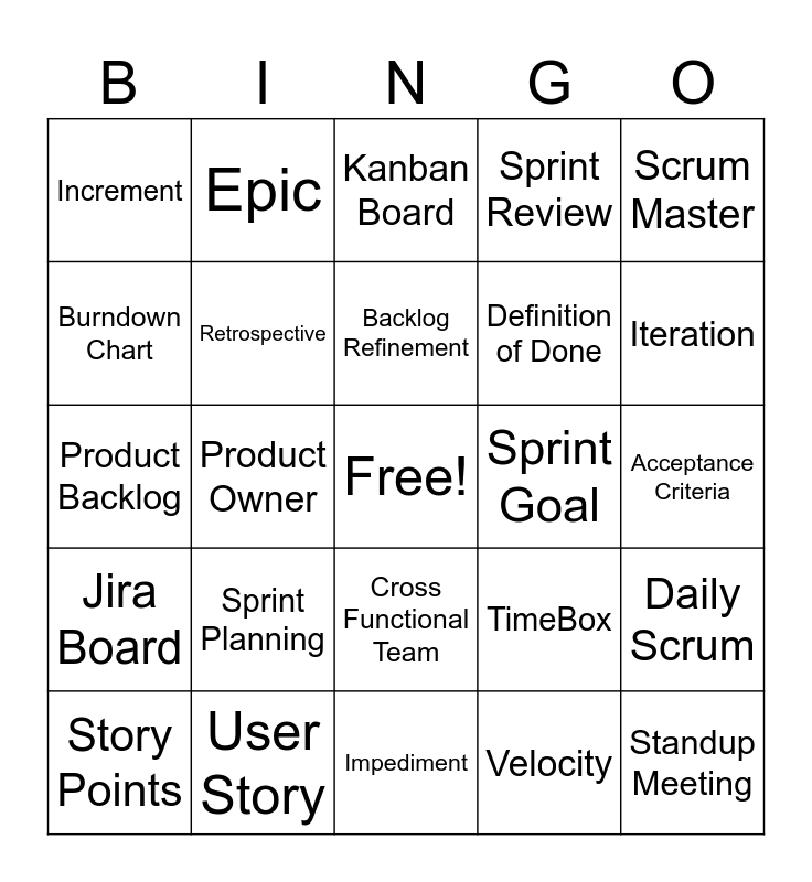 This bingo card has a free space and 24 words: Sprint Planning, User Story, Backlog Refinement, Story Points, Scrum Master, Increment, Burndown Chart, Epic, Sprint Goal, Cross Functional Team, Definition of Done, Product Backlog, TimeBox, Daily Scrum, Retrospective, Velocity, Acceptance Criteria, Kanban Board, Iteration, Product Owner, Standup Meeting, Jira Board, Sprint Review and Impediment.