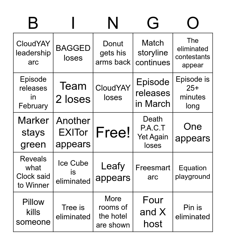 This bingo card has a free space and 24 words: Ice Cube is eliminated, Tree is eliminated, CloudYAY loses, Pillow kills someone, The eliminated contestants appear, CloudYAY leadership arc, Episode releases in February, BAGGED loses, Death P.A.C.T Yet Again loses, Leafy appears, Episode releases in March, Marker stays green, Freesmart arc, Equation playground, Team 2 loses, Four and X host, One appears, Donut gets his arms back, Episode is 25+ minutes long, Another EXITor appears, Pin is eliminated, Reveals what Clock said to Winner, Match storyline continues and More rooms of the hotel are shown.